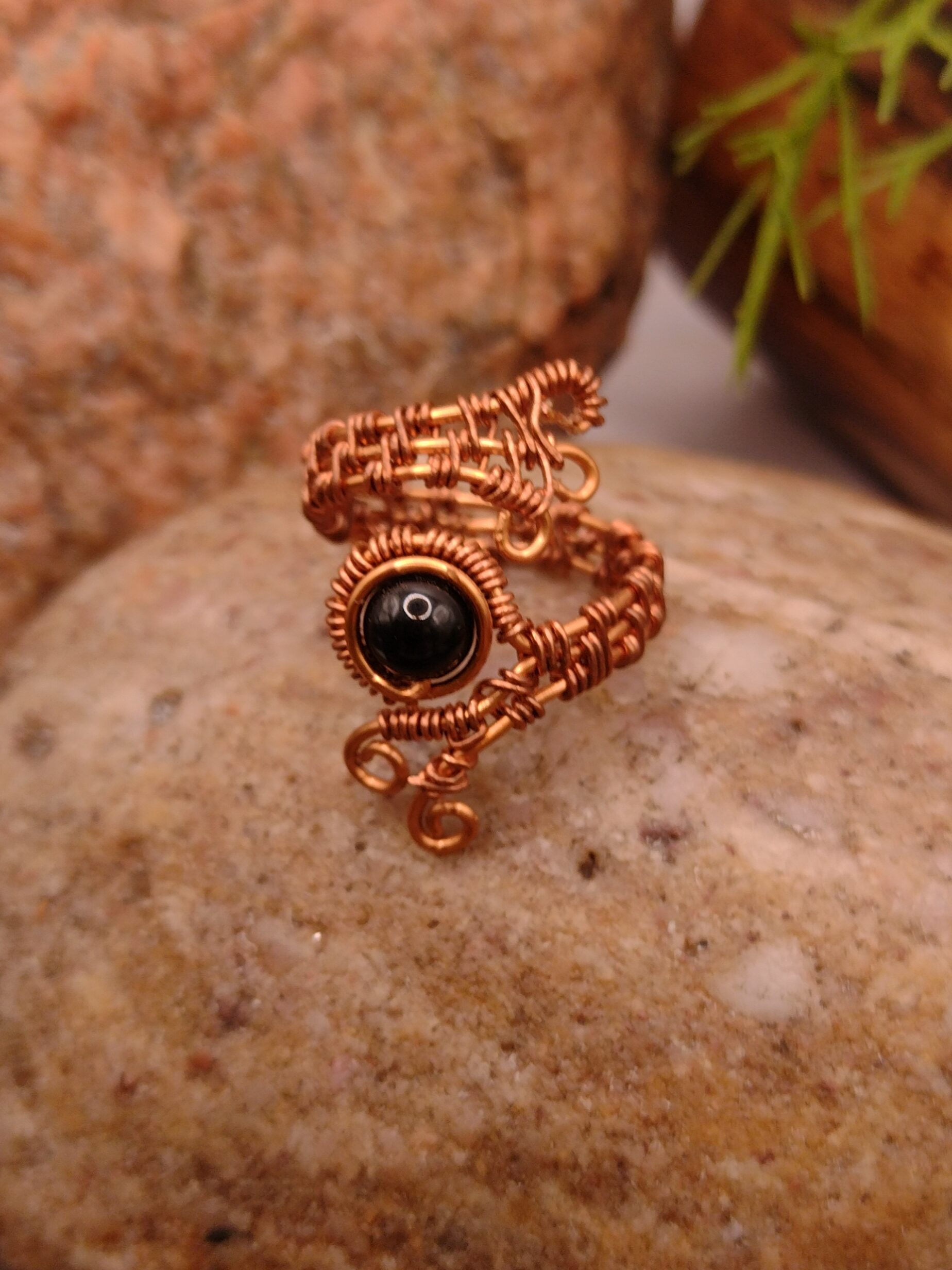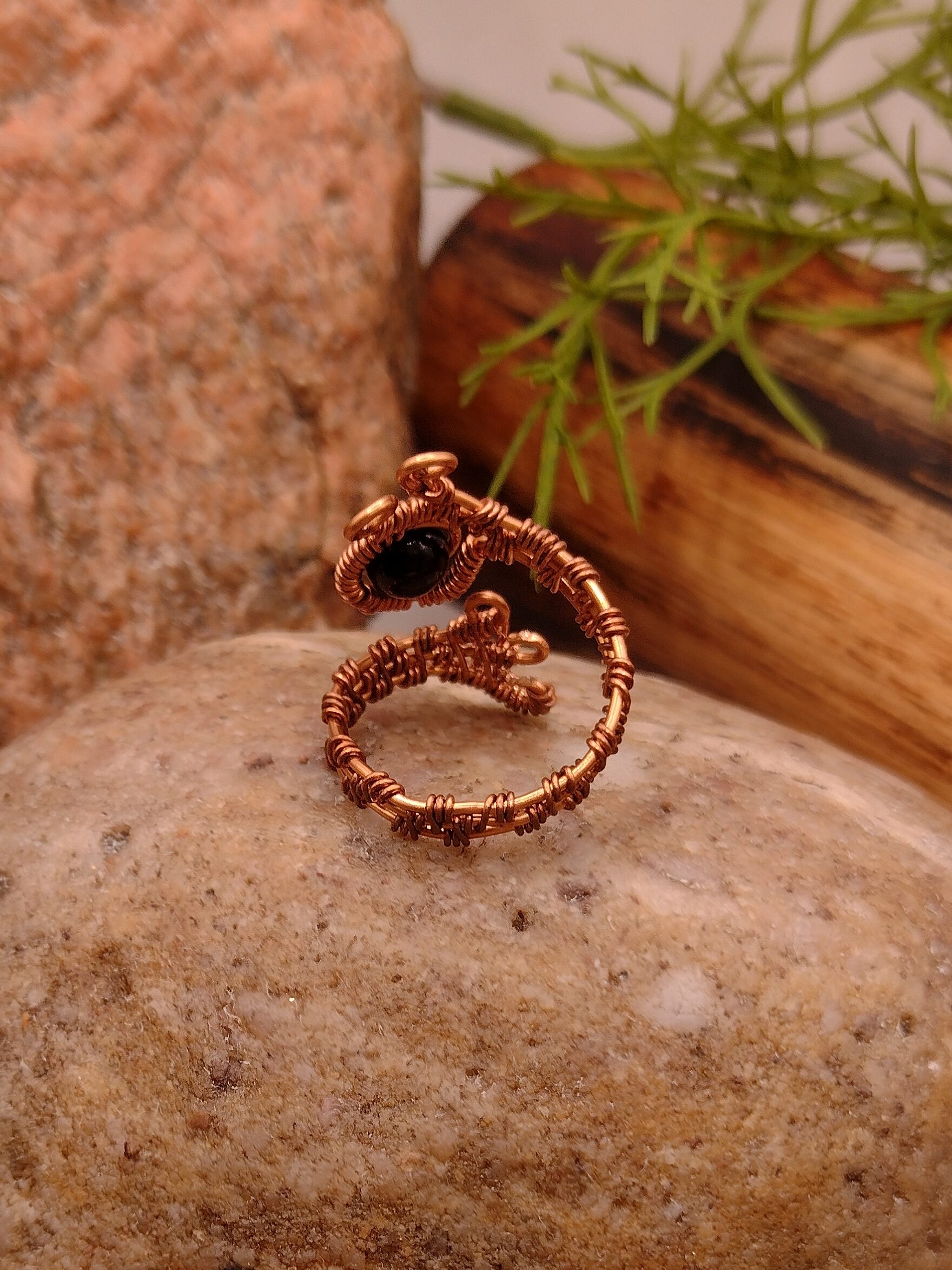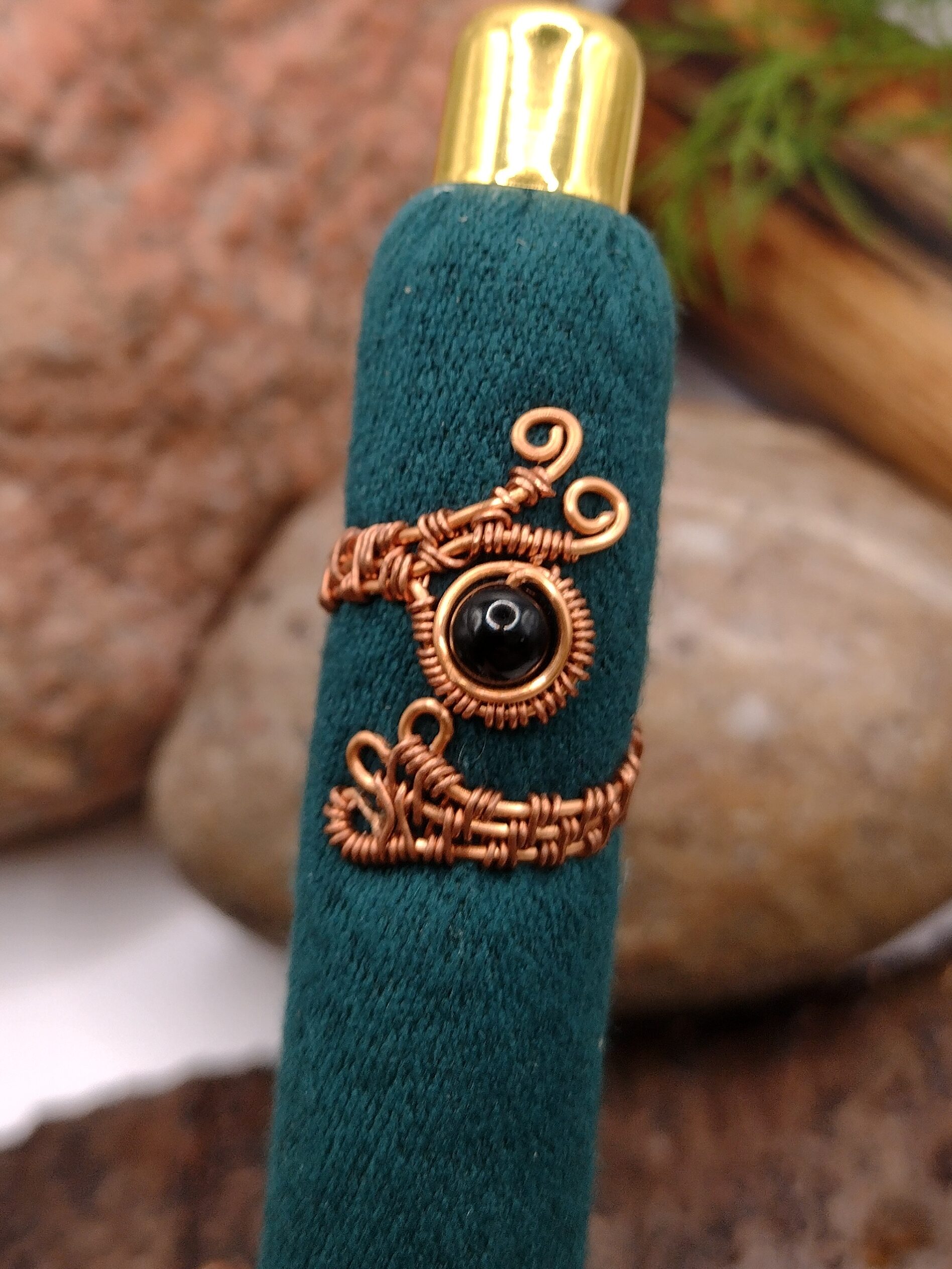 Pierścionek wykonany z miedzi, ozdobiony jednym naturalnym koralikiem czarnego turmalinu, osadzonym w misternie formowanej, ręcznie plecionej oprawie. Gładka, głęboka powierzchnia kamienia przyciąga uwagę swoją prostotą i intensywną czernią, która symbolizuje ochronę i ugruntowanie.