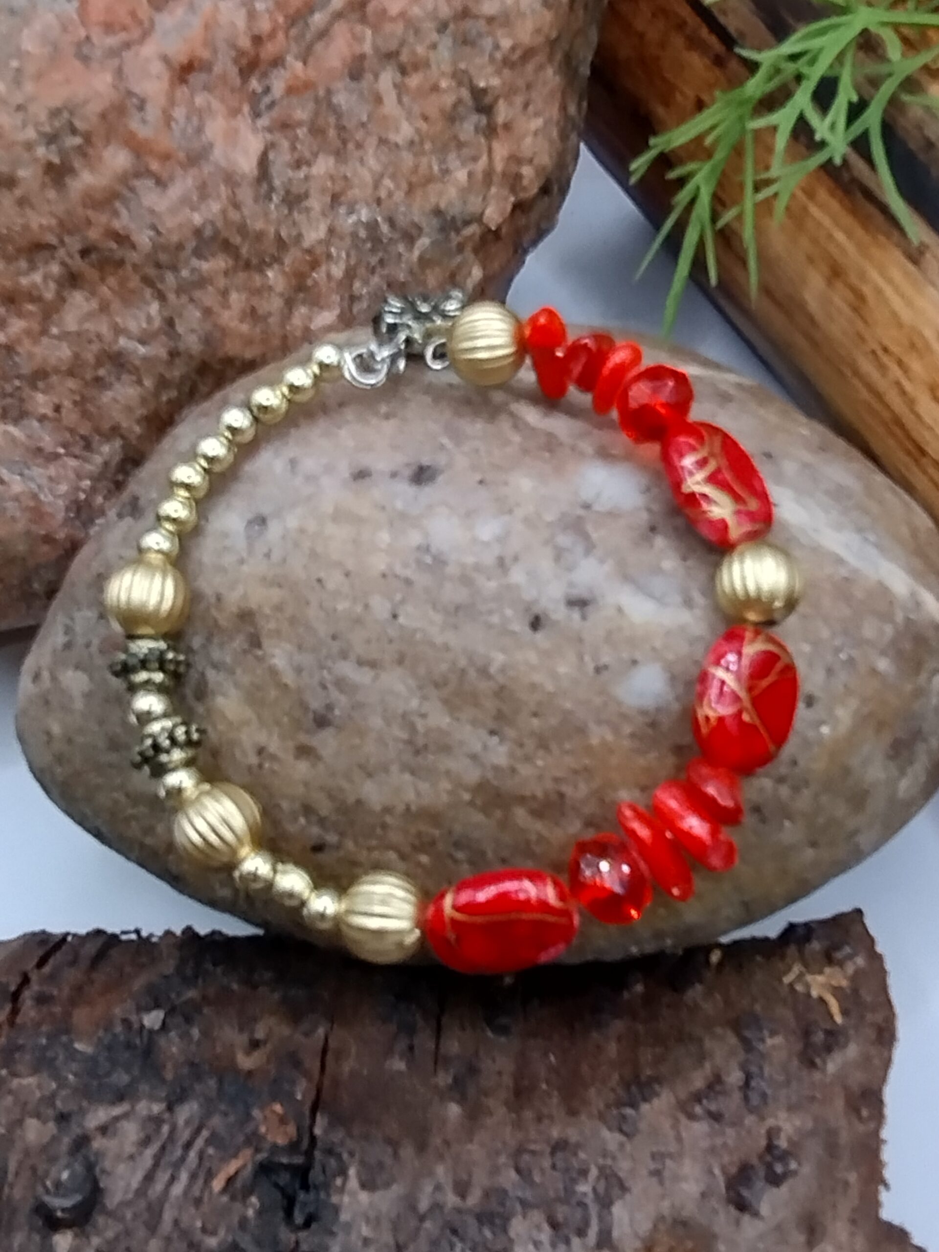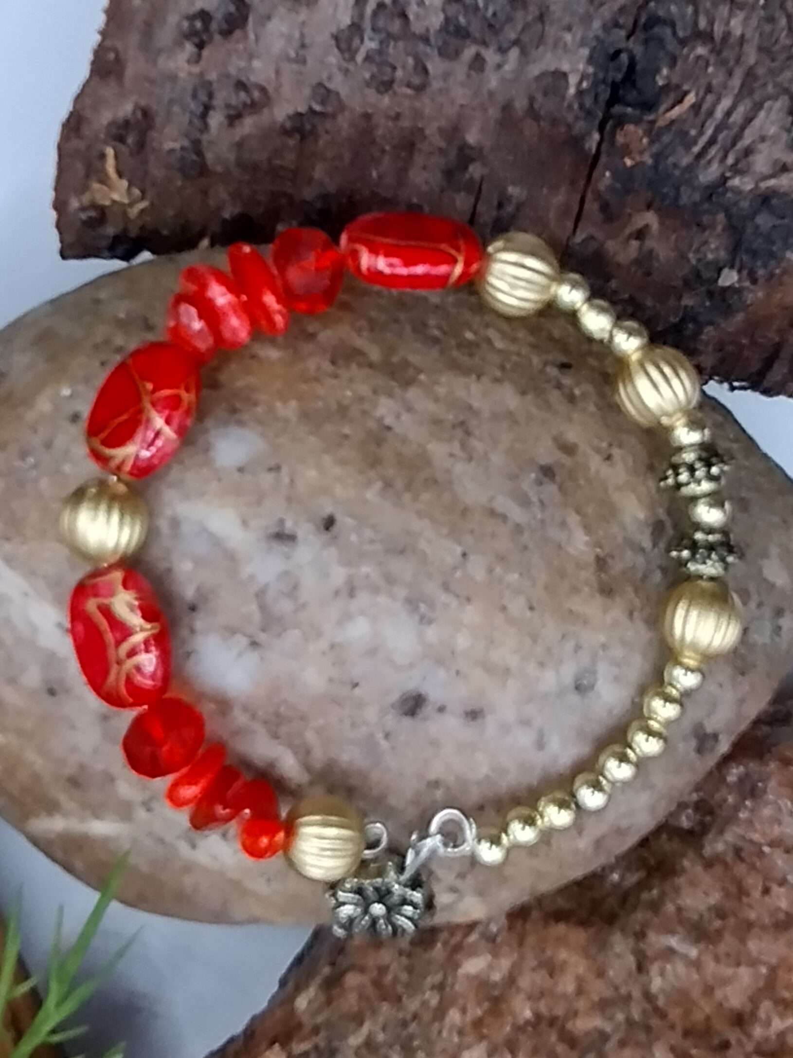 Ta bransoletka to wyrazista odsłona kobiecej energii zamknięta w lekkiej, wygodnej formie. Intensywna czerwień koralików pięknie kontrastuje ze złotymi przekładkami, tworząc biżuterię, która przyciąga spojrzenia i dodaje pewności siebie.