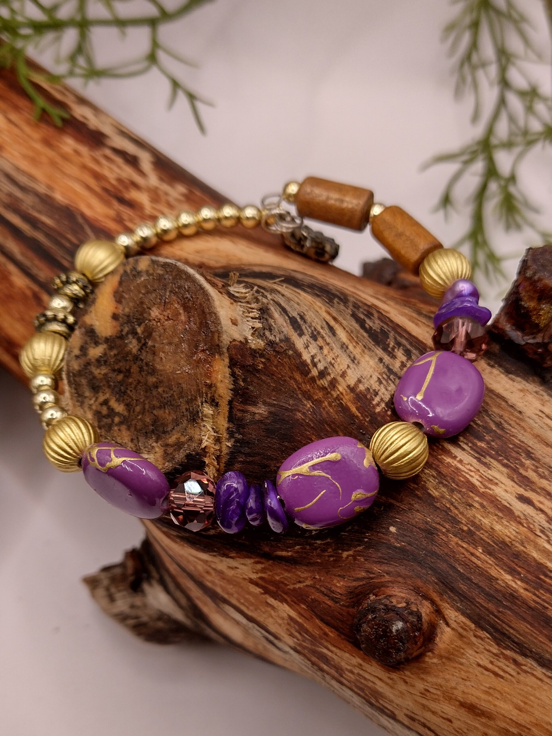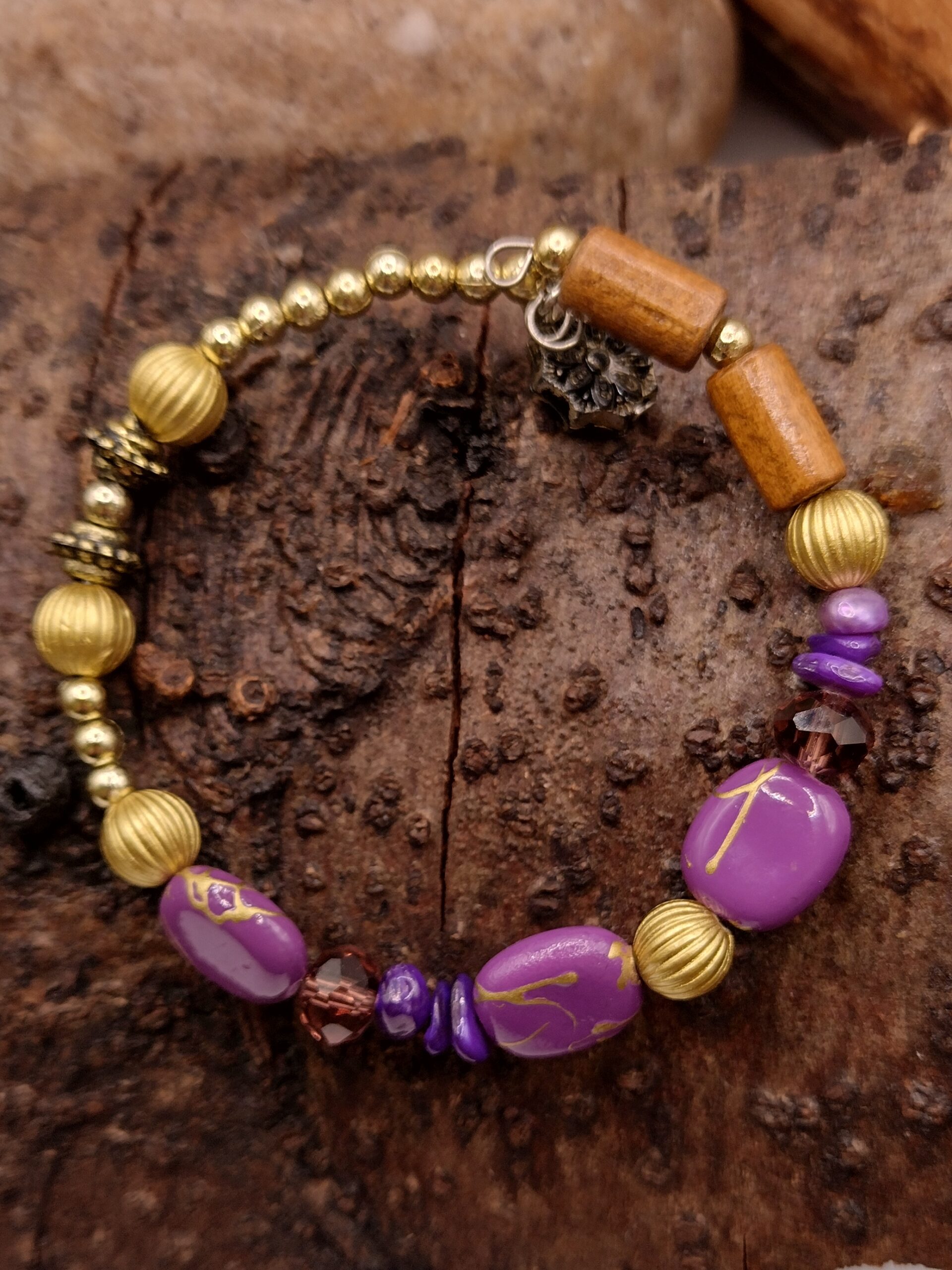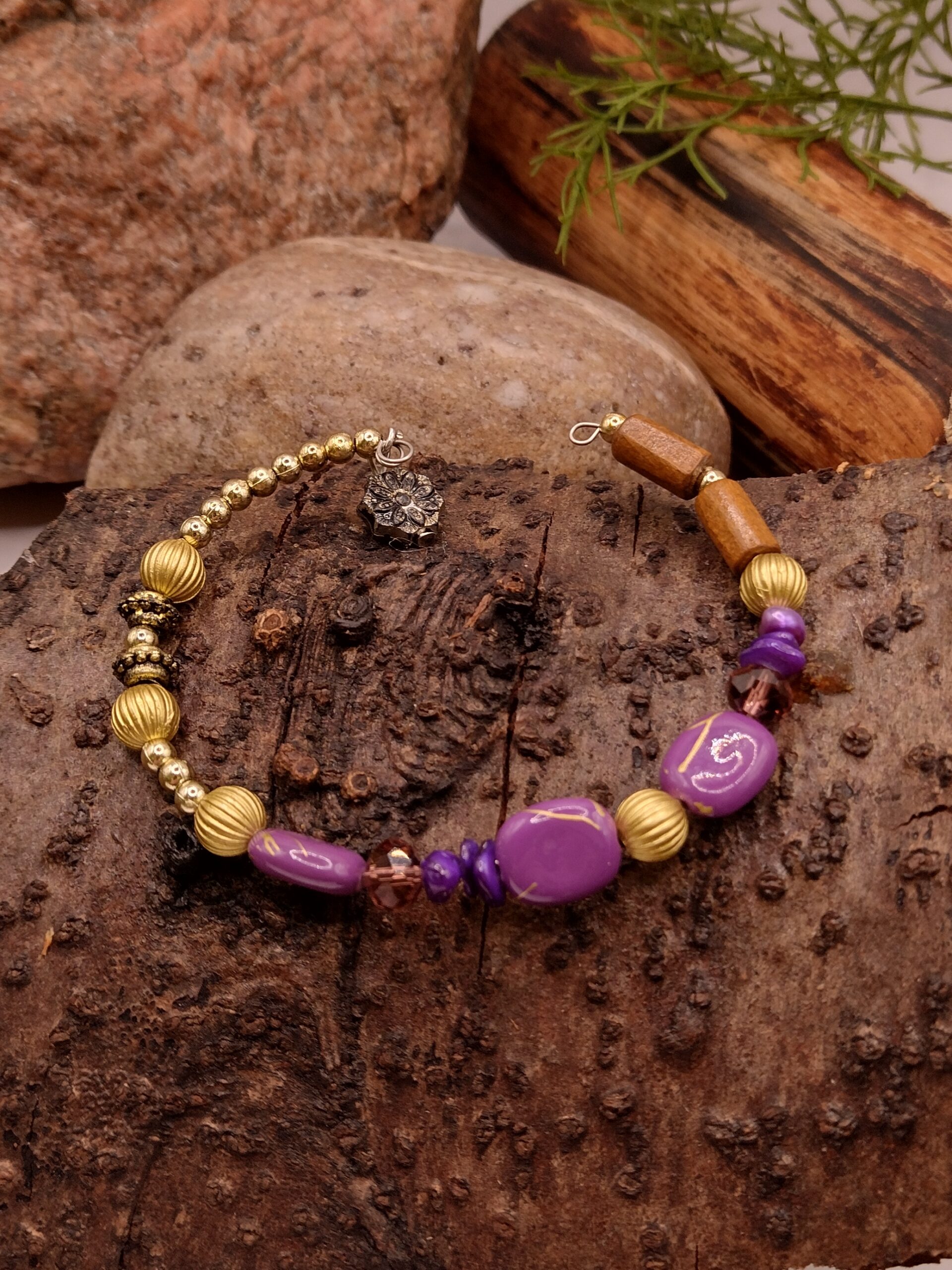 Bransoletka „Tańczące koraliki” – odcień fioletu. Fioletowa kompozycja koralików otula nadgarstek, a złote nici wiją się między nimi niczym ciepłe promienie światła przebijające przez liście. Delikatne muszlowe koraliki dodają naturalnego, organicznego uroku, a dwa fasetowane szklane koraliki w odcieniu brązu subtelnie połyskują w rytmie ruchu. Całość uzupełniają drobne złote kuleczki i przekładki, które nadają bransoletce elegancji i lekkości – to biżuteria, która emanuje spokojem i subtelną radością codzienności. To biżuteria, która otula nadgarstek z delikatnością i wdziękiem, gotowa towarzyszyć w każdej chwili.
