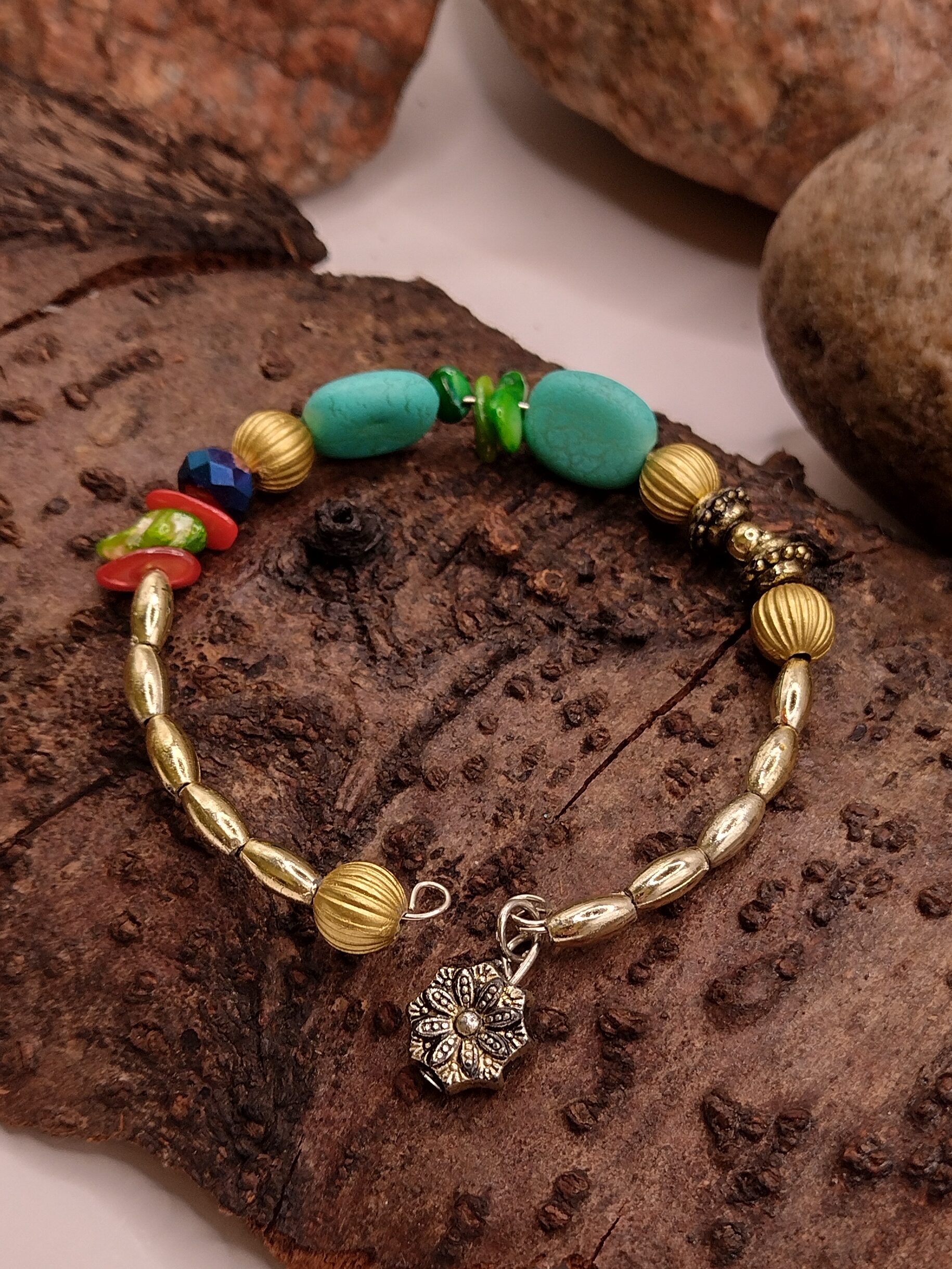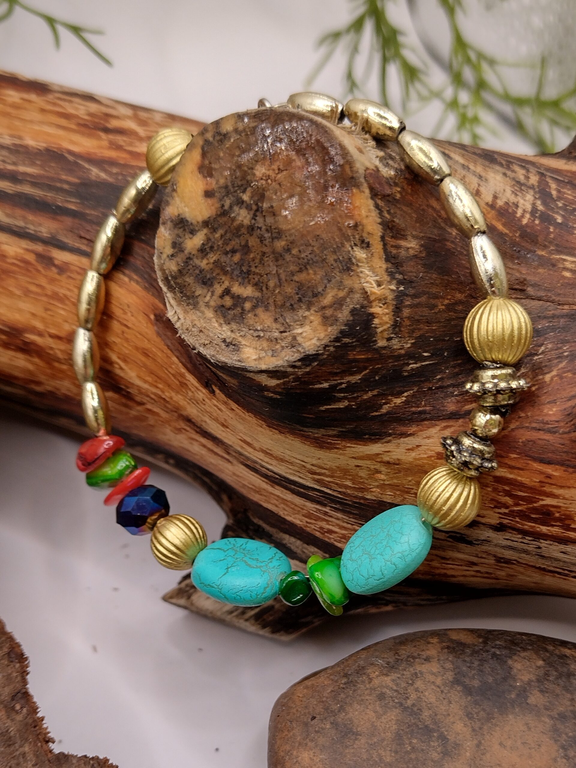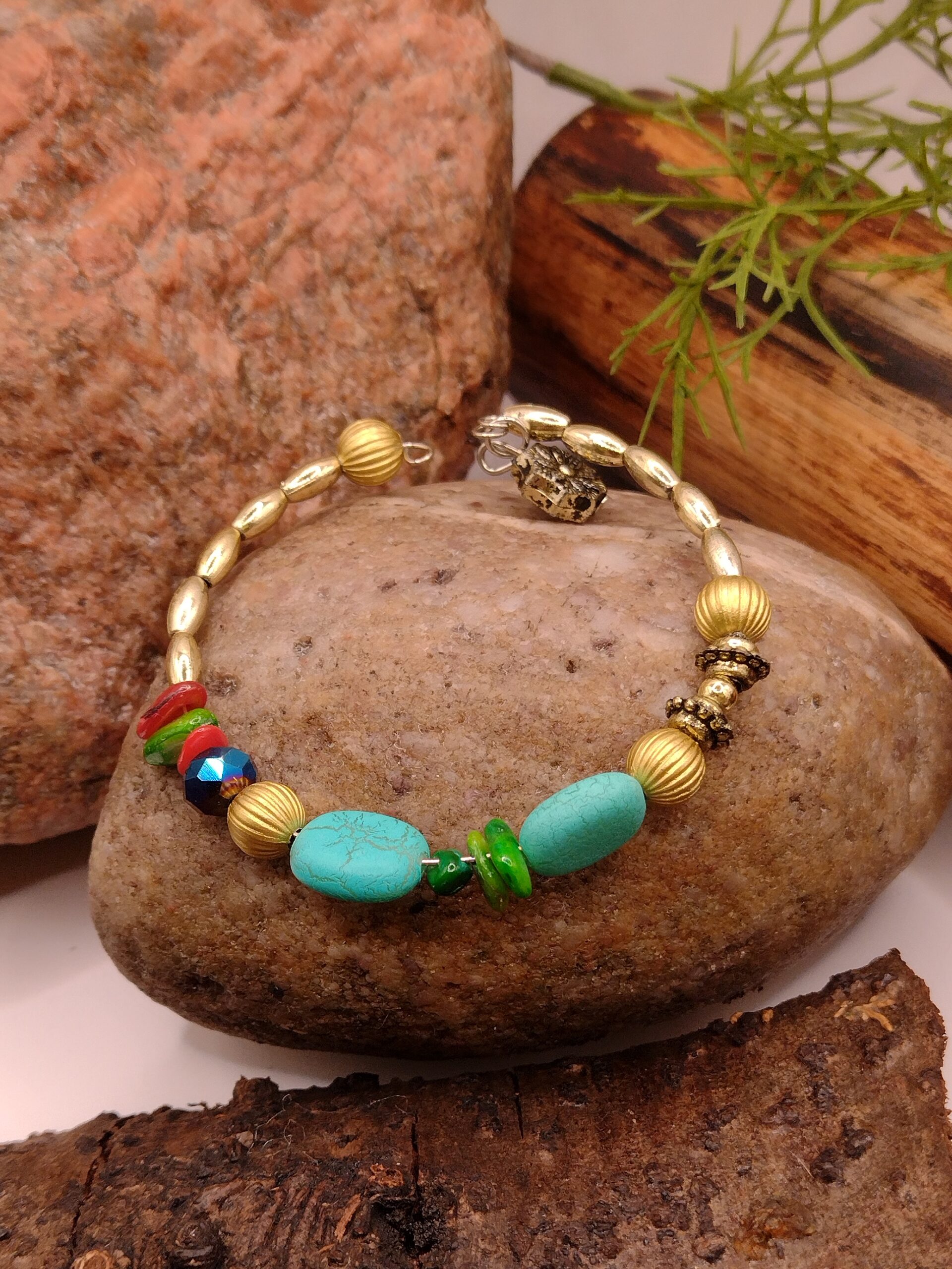 Połączenie dużych turkusowych koralików z drobnymi złotymi koralikami w kształcie ryżu tworzy harmonijną kompozycję, a kolorowe muszlowe kamyczki dodają bransoletce radosnego, wielowymiarowego charakteru. Duże złote okrągłe elementy podkreślają wyjątkowość wzoru i wprowadzają subtelny luksusowy akcent.