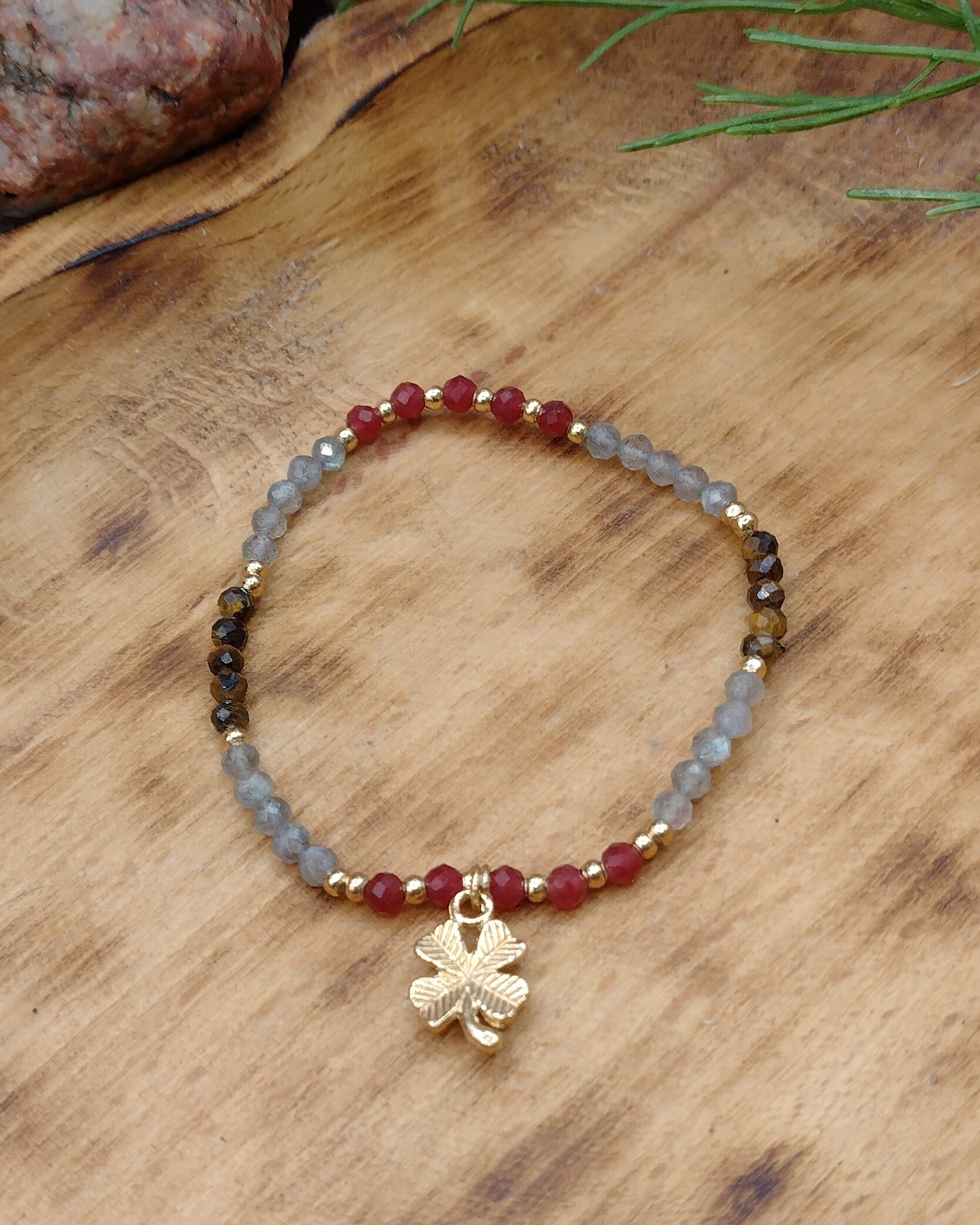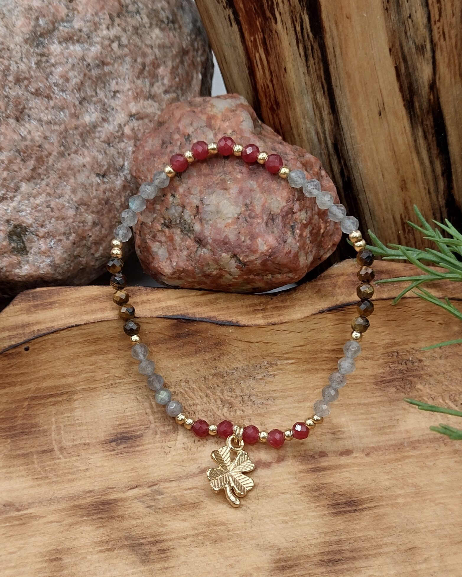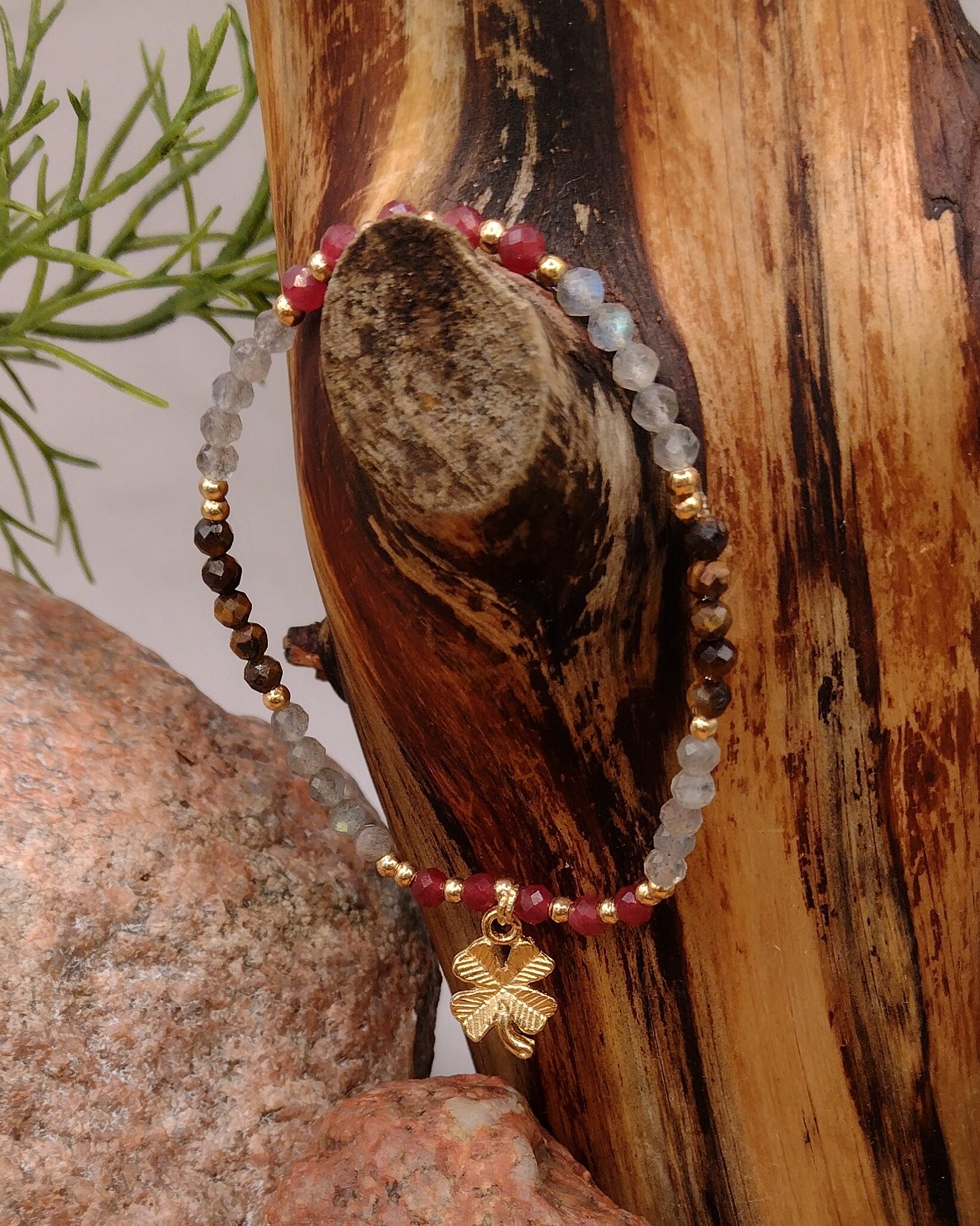 po 5 koralików z każdego kamienia – tygrysiego oka, czerwonego chalcedonu i labradorytu – ułożonych naprzemiennie. Pomiędzy każdą sekwencją kamieni znajduje się po jednym złotym koraliku, który oddziela energie i harmonizuje ich współdziałanie.