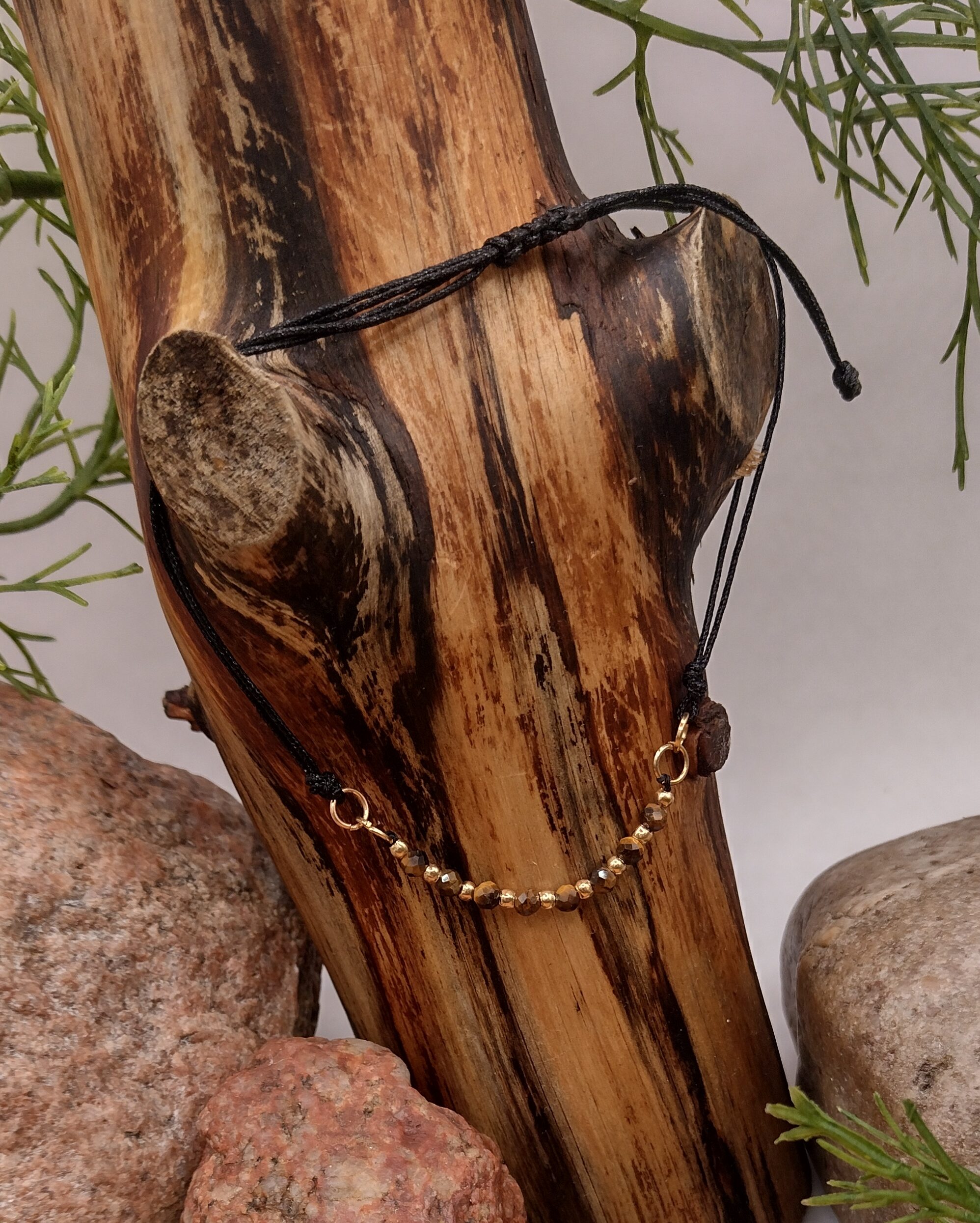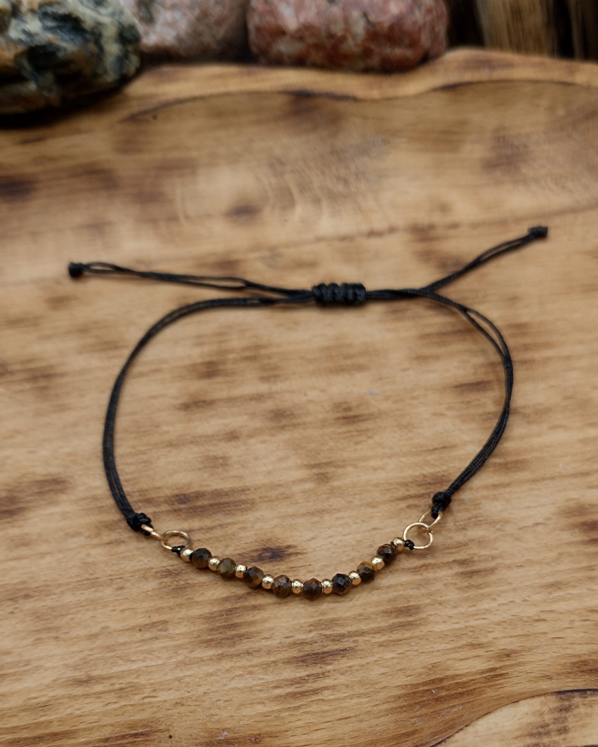Ta bransoletka została wykonana z 8 naturalnych koralików tygrysiego oka w ciepłym, brązowo-złotym odcieniu, umieszczonych na czarnym sznureczku z regulowaną szerokością. Pomiędzy kamieniami znajdują się złote kuleczki – przekładki, które podkreślają głębię koloru kamienia i symbolizują siłę, stabilność oraz obfitość.