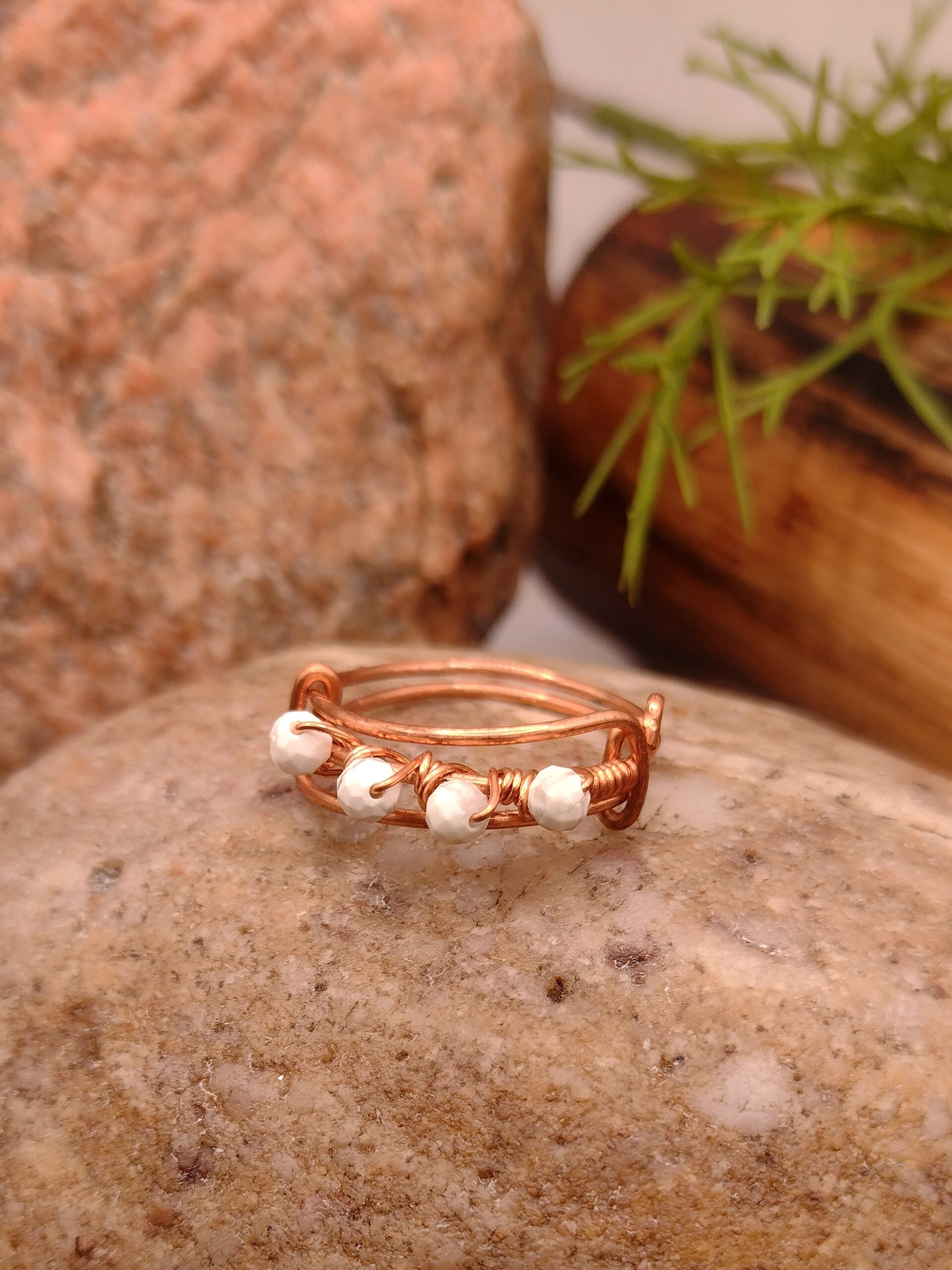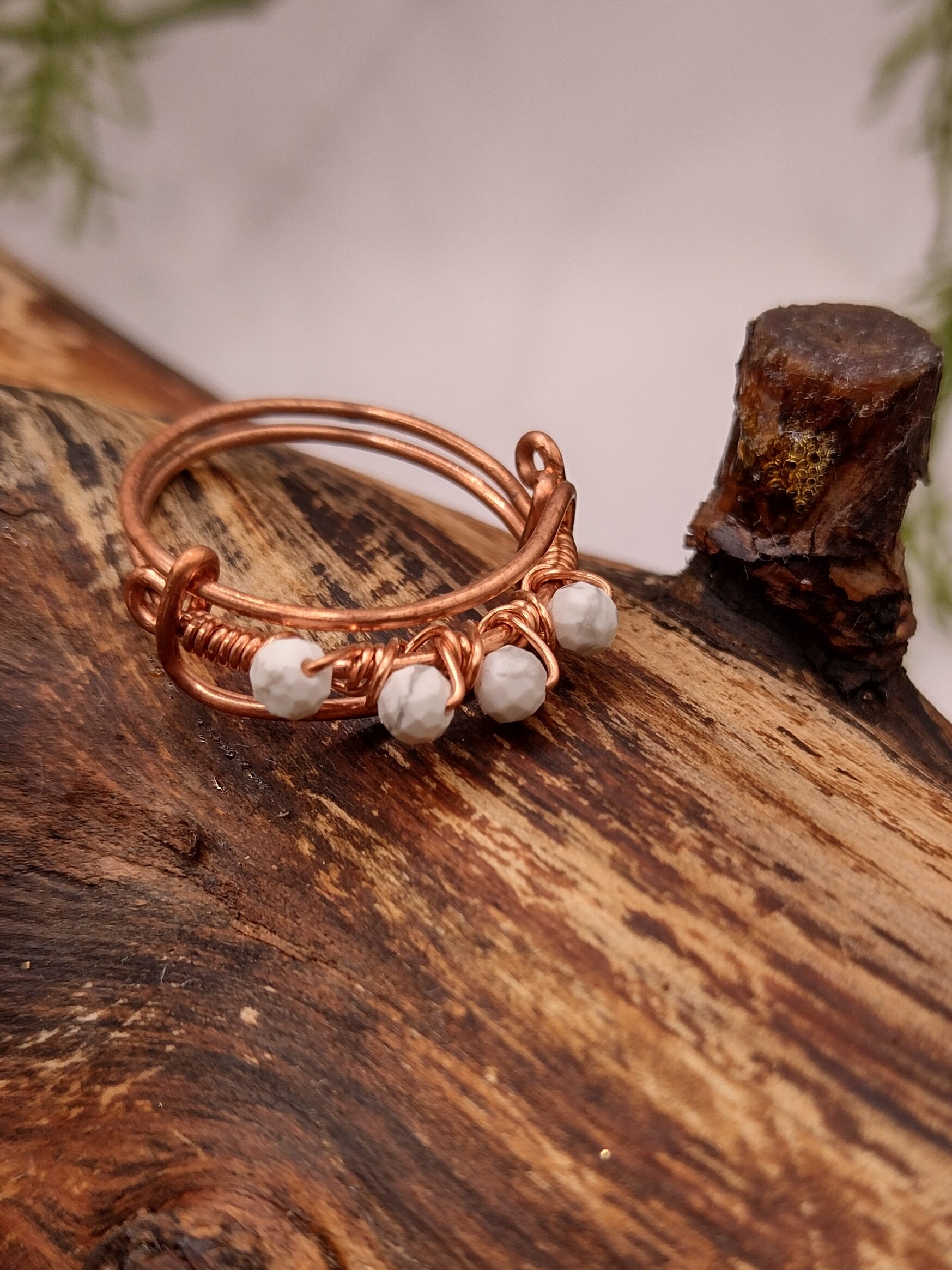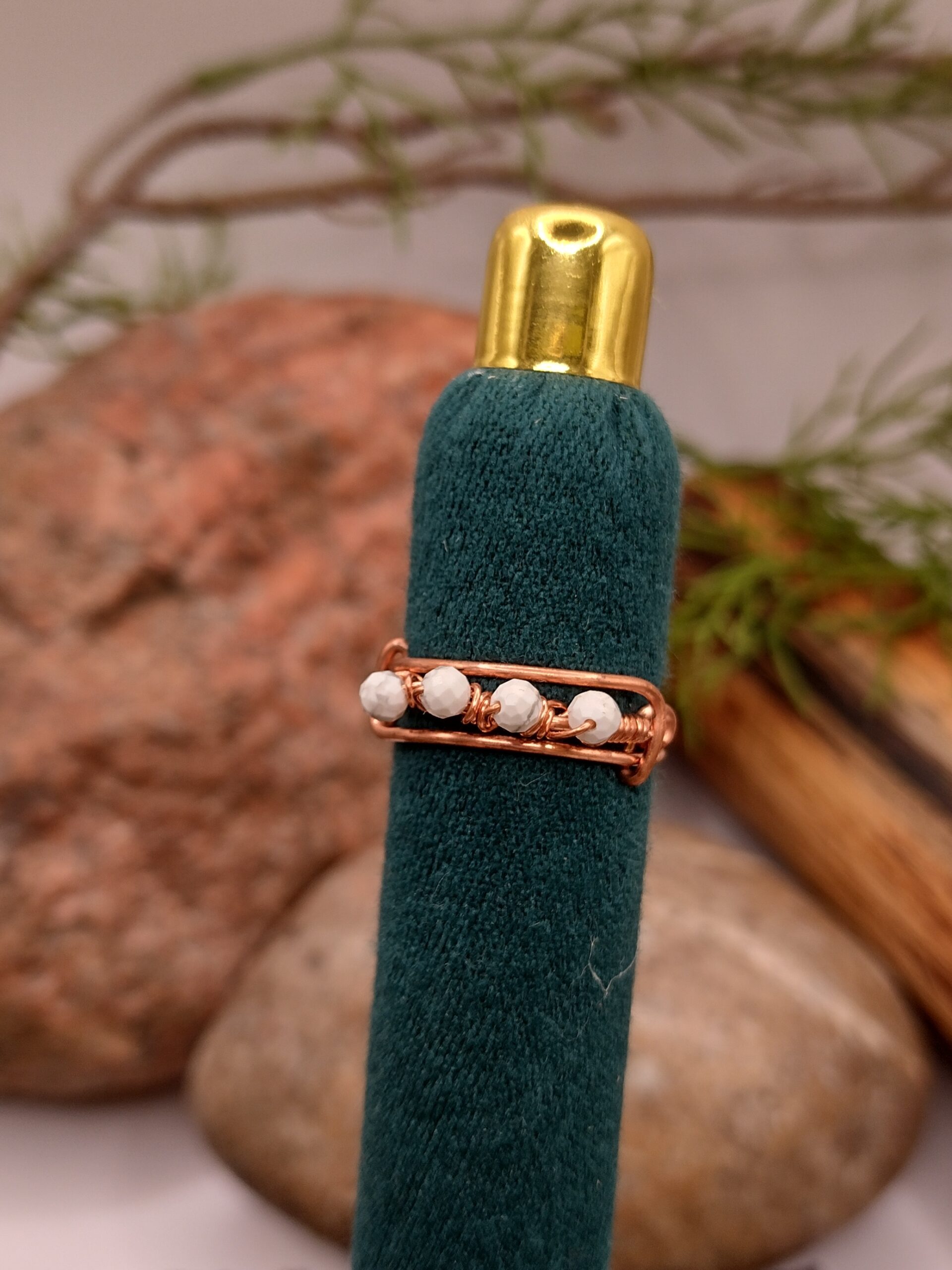 Delikatny pierścionek wykonany z miedzi, ozdobiony czterema malutkimi koralikami naturalnego białego howlitu — kamienia kojarzonego z wyciszeniem, harmonią i klarownością myśli. Howlit ceniony jest za swoje właściwości uspokajające oraz wspierające wewnętrzną równowagę, pomaga wyciszyć nadmiar bodźców i wrócić do spokojnego, naturalnego rytmu.