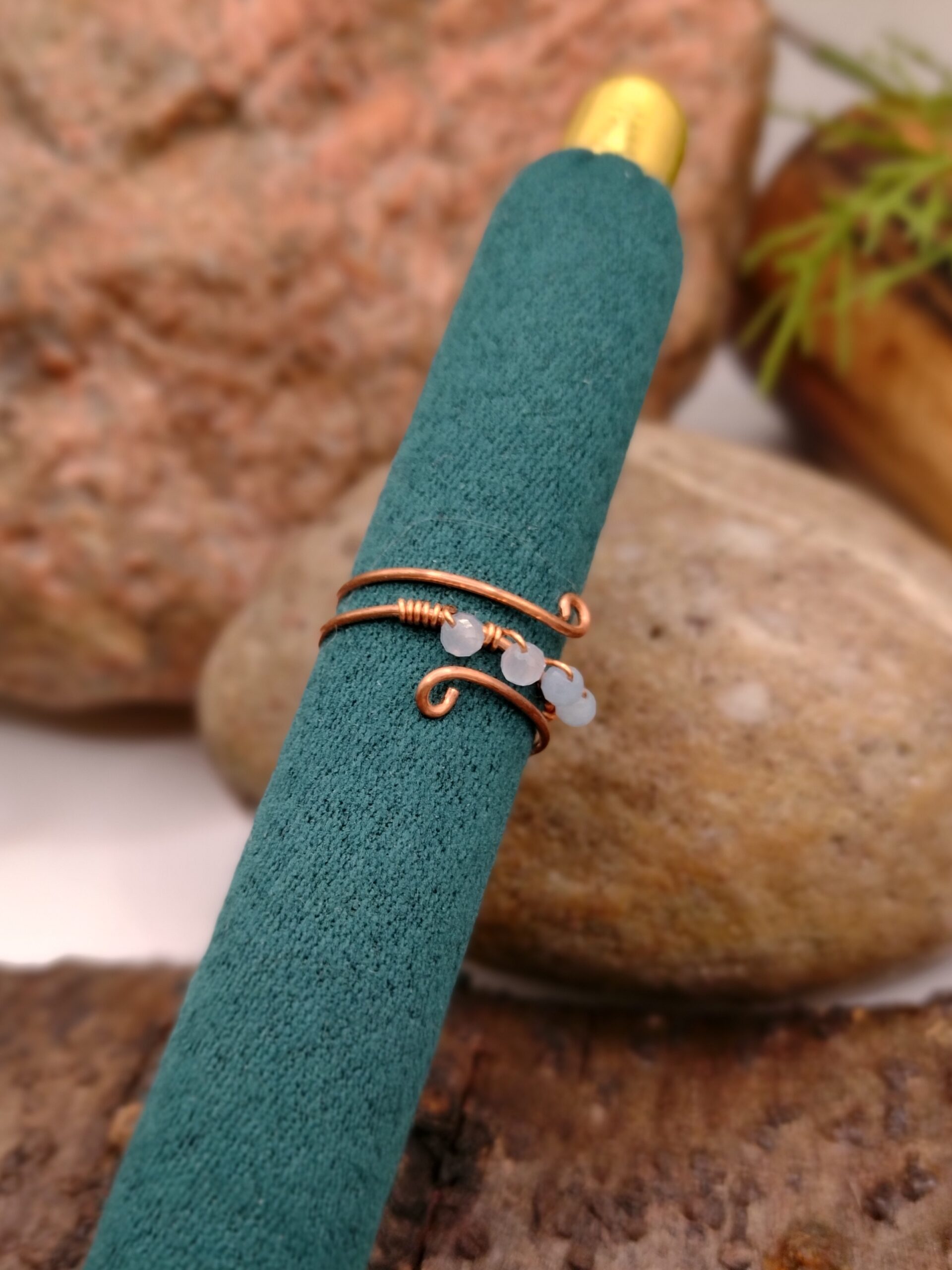 Drobne zawiasy po bokach podkreślają rękodzielniczy charakter biżuterii. Miedziana forma zachowuje minimalistyczny styl i naturalną elegancję. Pierścionek sprawdzi się na co dzień i podczas wyjątkowych okazji. Może stać się osobistym talizmanem lub subtelnym dodatkiem do stylizacji.
