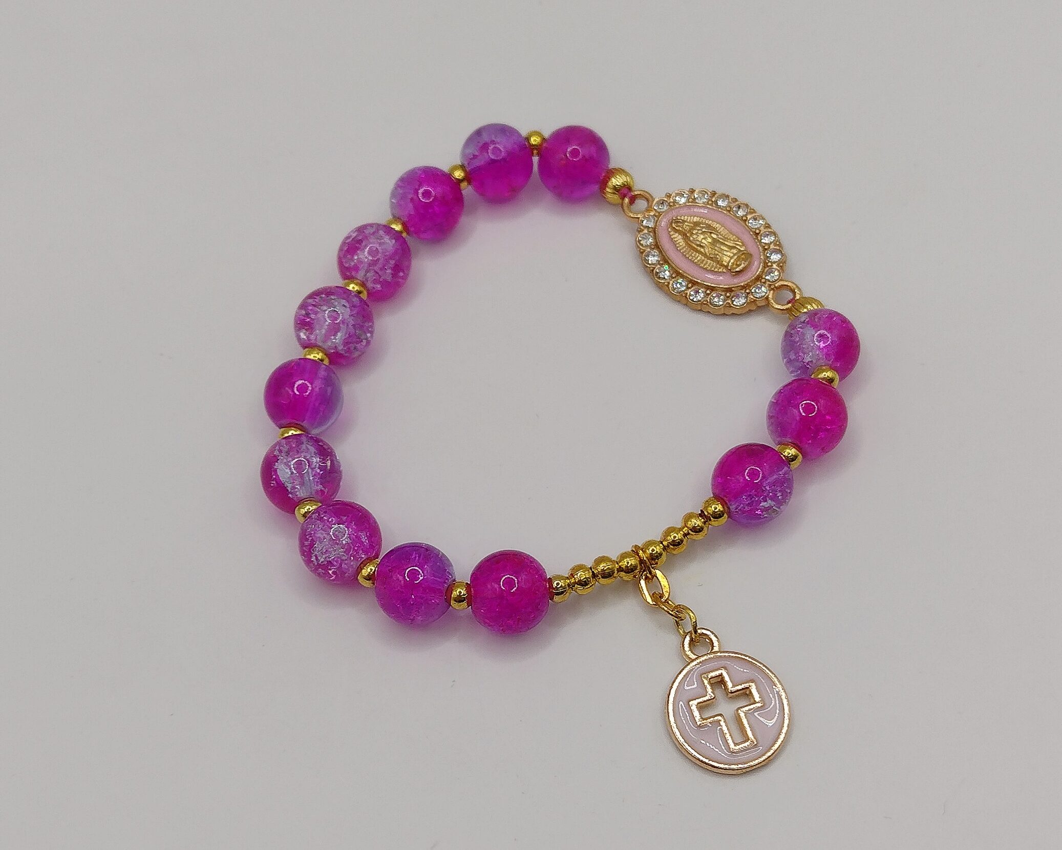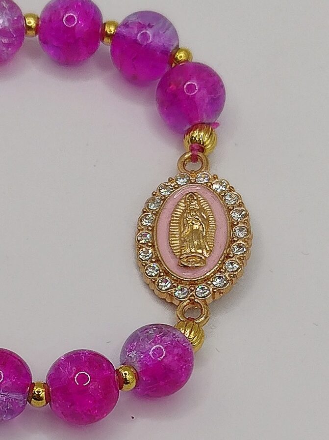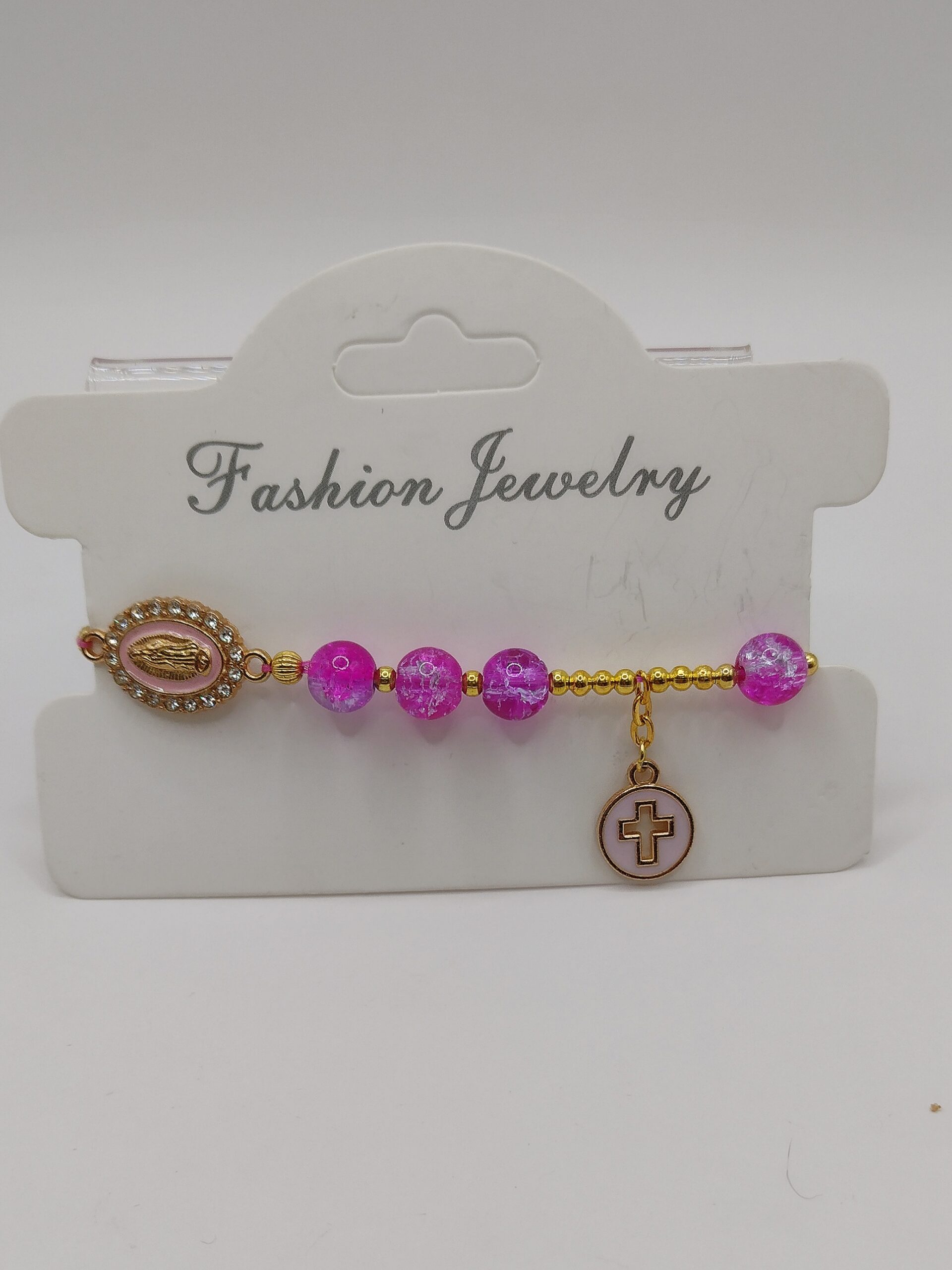 Centralnym elementem bransoletki jest medalik z wizerunkiem Matki Boskiej, osadzony na delikatnym różowym tle i otoczony drobnymi cyrkoniami, które dodają całości sakralnego blasku. Dodatkowym akcentem jest okrągła zawieszka z krzyżem, symbolizująca wiarę, ochronę i obecność Boga w codzienności.